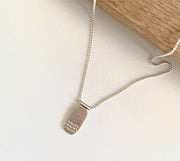 A small long rectangular pendant carefully stamped with tiny scalloped curves, reminiscent of waves. Made from 925 sterling silver, the surface has been given a matt finish. It hangs from a small ‘tube’ connector on a 66cm sterling silver ball chain. The rubber inner slider bead allows it to be adjusted to however long or short you need.