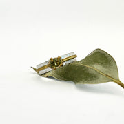 The main silver band has a hammered finished with a smooth thin outer band of flat brass. The claw style bezel is rustic and bold and holds the moon-like peridot.