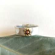 The super fine dotted feature flower has a copper centre (resembling rose gold) and tiny brass circling dots (resembling gold). It has been inspired by our Jnr FAV ring.