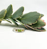 Oh my!  A special ring as it is our first using a coloured stone. The Peridot is a baguette faceted green olivine gem encased in a silver rectangular bezel.  Small brass squares sit either side to help highlight the beautiful green.