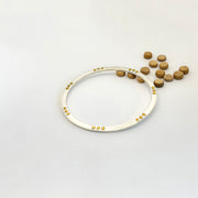 These Triple Dot bangles are solid sterling silver. Wider than most, and different to most as the sets of three alpha yellow brass dots (ie the feature bits) appear on their ‘thickness’ side. (Note the underside features the same set of three squares but simply embossed into the surface)