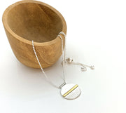 A disc base of 925 sterling silver has a centred ‘bar’ feature that has been matte plated with 18ct gold vermeil. And below this bar, fine vertical lines incised.