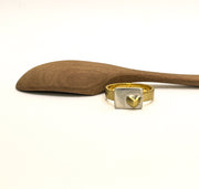 A playful ring featuring a small brass heart in the bottom corner of a sterling plate/plaque. Ring band is brass. Simple and fun.