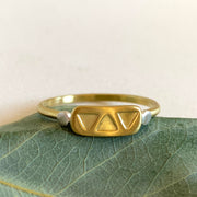 Just for fun, this fine rounded band ring has been hand made from alpha yellow brass.  Reminiscent of classic signet rings, the feature front plaque is decorated with small stamped triangles, whilst two little sterling silver dots are balance either end. Lovely to wear stacked with other gold and/or silver rings.